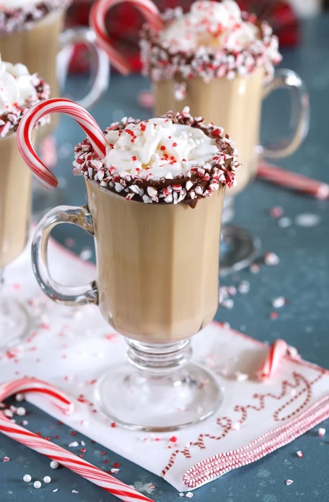 Preparing a fantastic homemade hot chocolate is the first step in making these boozy peppermint mochas. Vodka, crème de menthe, whipped cream, and crushed candy canes are added afterward. The end product is a warm, lively drink with lots of holiday flair. A fantastic holiday drink for the fireplace!